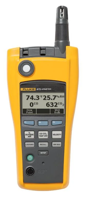 Para la campaña de referenciación del SCD30, el instrumento utilizado fue el Fluke 975 AirMeter (Figura 4.4), este es un instrumento portátil de diagnóstico de la calidad del aire interior. Este dispositivo mide simultáneamente temperatura, humedad relativa, dióxido de carbono (CO2) y monóxido de carbono (CO).
