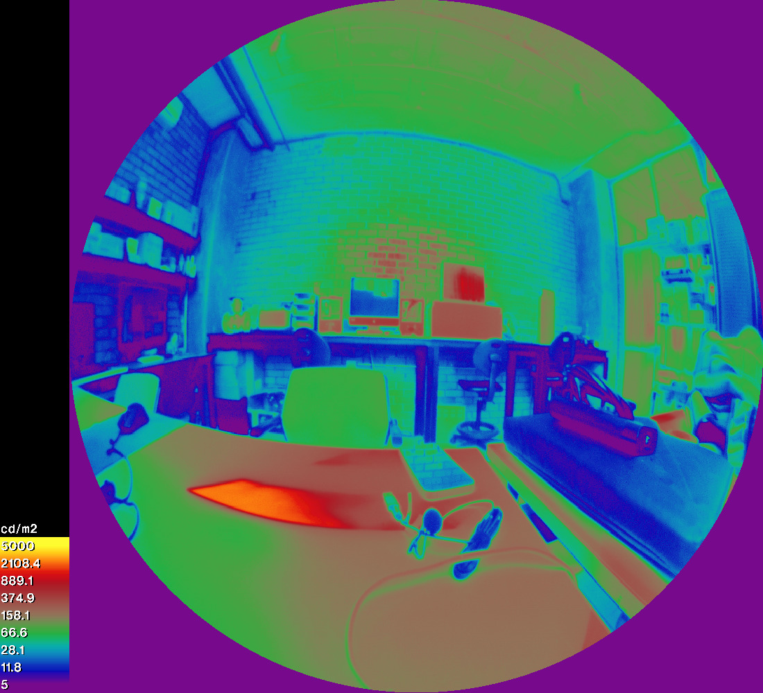 y se desarrolló un script que calcula la iluminancia total mediante la integral de los valores de luminancia que conforman el mapa generado a partir de las imágenes capturadas (Figura 4.17). El proceso inicia con la creación de una imagen HDR a partir de la fusión de fotografías tomadas a diferentes exposiciones, lo que permite capturar la mayor cantidad de información posible sobre la intensidad luminosa. Posteriormente, a esta imagen HDR se le aplica una escala de false color para identificar los valores de luminancia en cada punto de la imagen. El cálculo de la integral para el mapa generado facilita la determinación de la iluminancia total del espacio interior en el momento de la captura.