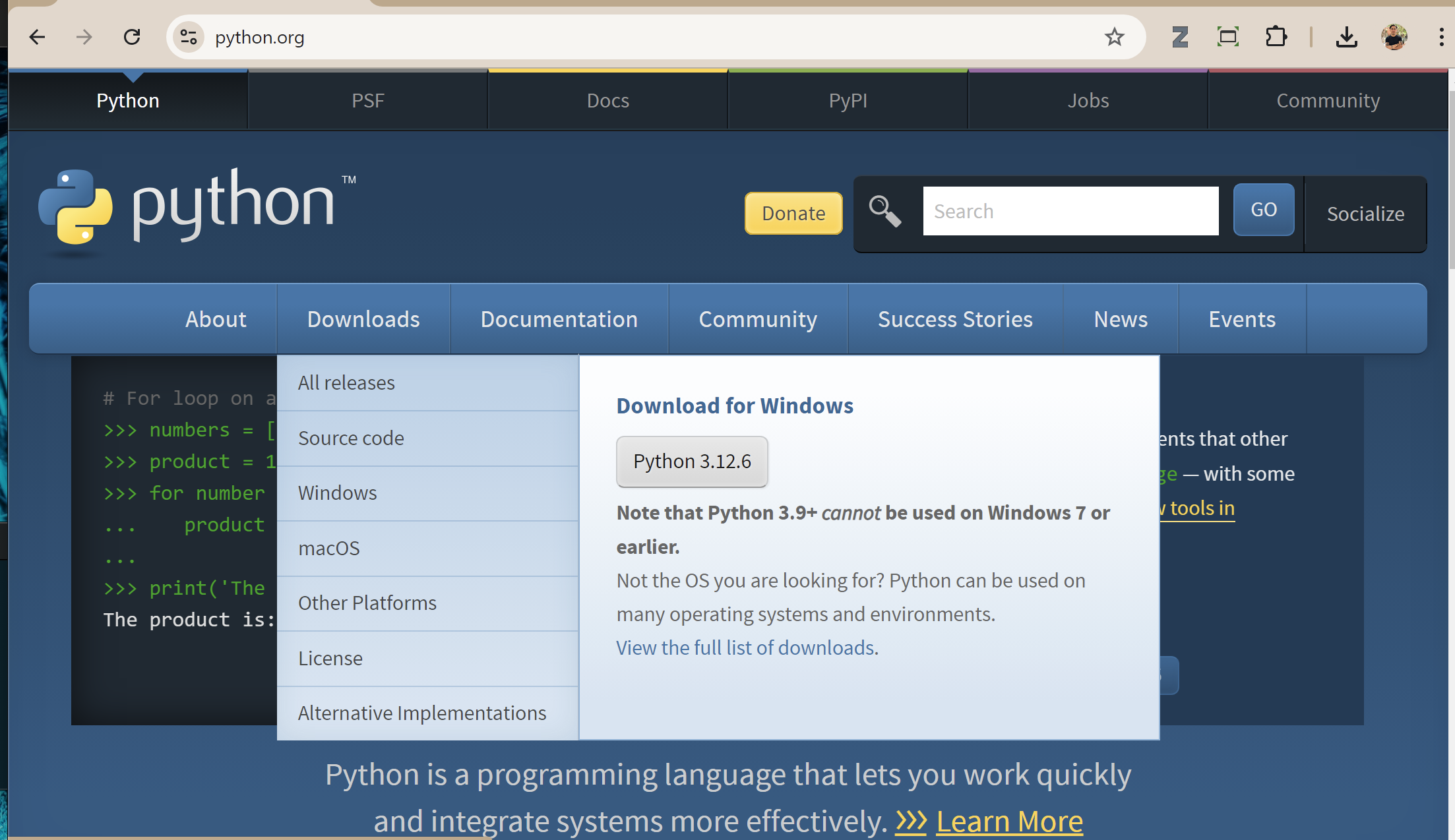 Ve python.org, selecciona y descarga Python para instalar en tu sistema operativo.