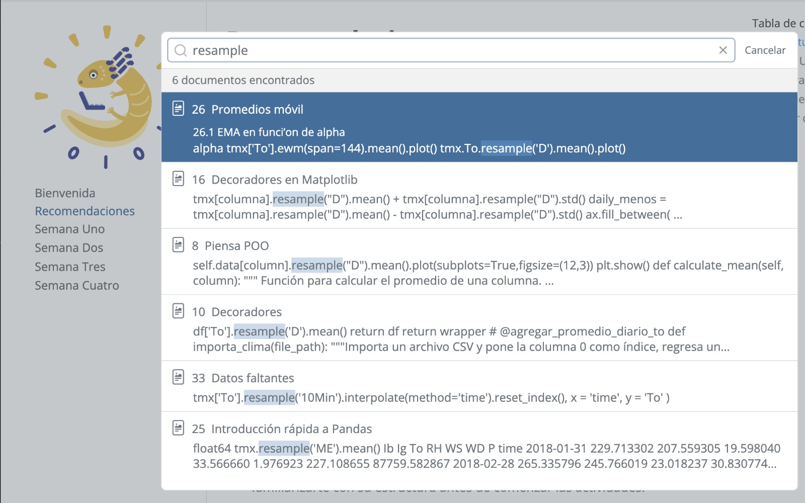 Si necesitas encontrar ejercicios que utilicen un comando específico de Python o aborden un concepto particular, utiliza la barra de búsqueda, ubicada en la parte superior derecha. Esto te permitirá cruzar toda la colección de libretas rápidamente, identificando ejemplos, explicaciones y problemas prácticos que hacen uso del comando o tema que quieres revisar. Esta función es ideal para estudiar funciones específicas, para la revisión de temas de interés en tus proyectos o para recordar esa configuración especial en algún comando.