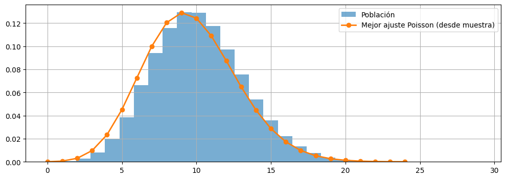 ax.plot(x, poisson.pmf(x, sample_mean), 'o-', lw=2, label='Mejor ajuste Poisson (desde muestra)')