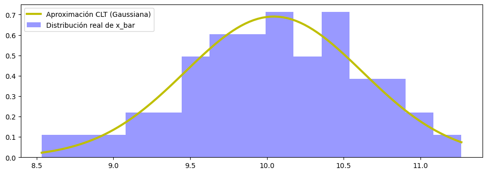 ax.hist(sample_means, bins=15, density=True, alpha=0.4, color='blue', label='Distribución real de x_bar')